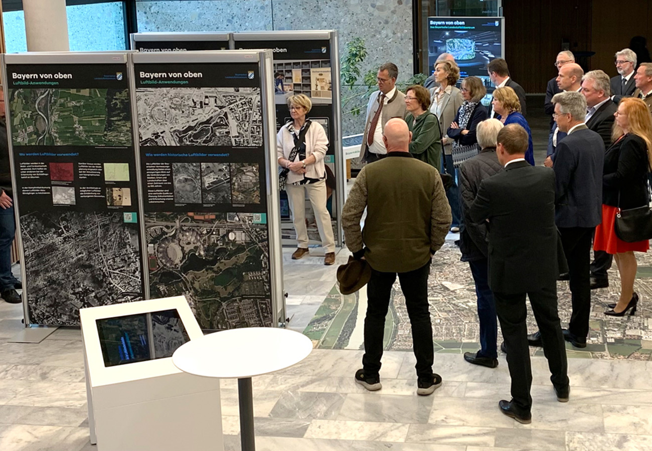 Anlässlich des fünfjährigen Bestehens des Bayerischen Landesluftbildzentrums stellte die Wanderausstellung dessen Angebote einem breiten Publikum vor. Die multimedial gestaltete und leicht verständlich aufbereitete Ausstellung vermittelt einen spannenden Einblick in die Geschichte und Technik der Luftbildfotografie. Auf 14 Ausstellungstafeln wurde den Besucherinnen und Besuchern gezeigt, wie Luftbilder gemacht werden, wie sie aufbereitet werden und wo sie eingesetzt werden.